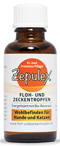Zepulex Floh- und Zeckentropfen ist das seit Jahren von uns und unseren Kunden erprobte Produkt für Hunde und Katzen. Die Basis ist eine 0,9 % Kochsalzlösung die mittels Bio-Resonanz „informiert“ wird (siehe Literaturhinweis). Die Tropfen sind chemiefrei, geruchsfrei und geschmacksneutral.